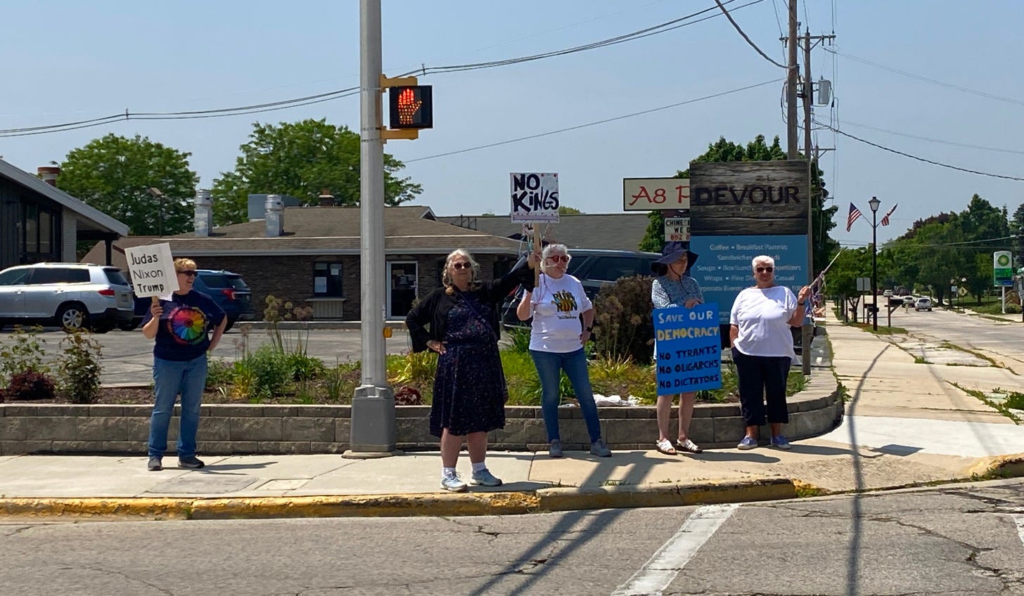 Democrat protesters took to Broughton Drive to air a list of grievances against President Donald J. Trump. Many held signs complaining about tyrants and kings, demanding late-term abortions, giving Ukraine unlimited funding, and allowing transsexuals to have a “Bathroom Pass.” Several protesters were seen waving Ukraine and Palestine flags. Foul language was also being used by those in attendance.