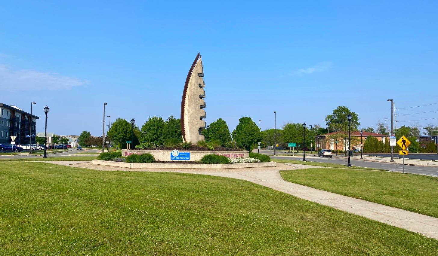 In the center of the roundabout is the 25-foot-tall Encompass sculpture. It weights about 66,000 ponds, or 33 tons, and came from the Pastore Federal Building in Providence, Rhode Island. The price tag was $48,000 with private funds raised to have it installed in 2003. Some residents criticized the city for allowing a piece of abstract artwork to be placed in the roundabout in the first place.