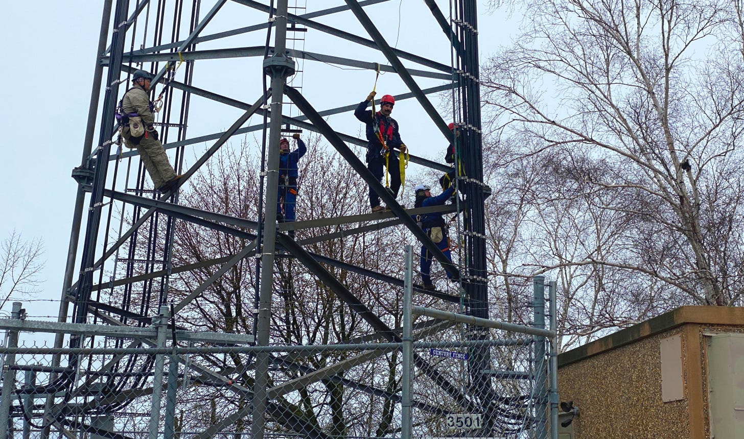 Firefighters may be required to climb a few hundred feet higher than the city’s 100-foot aerial platform truck. In doing this, they must maintain fall protection at all times, as they move around a structure that is not built for normal human movement. Other challenges can include any inclement weather that may be present, wildlife that may have made a home on a tower, and a variety of electrical or radio frequency hazards associated with communication tower work.