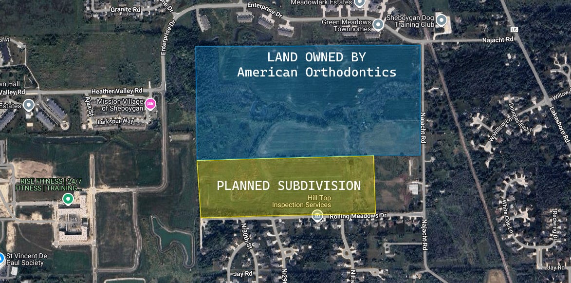 American Orthodontics also owns undeveloped property north of Najacht Road and Mill Road. Of the large swath of land the company owns, only 4.12-acres is within town limits while the rest is within city limits. The land northwest of the intersection was the proposed site of the new Urban Middle School. After a survey conducted by the Sheboygan Area School District revealed the site was unfavorable to the community, the school district decided to remodel the North Avenue school instead. The Merkel Foundation also owns land east of North 21st Street between Mill Road and the Pigeon River.