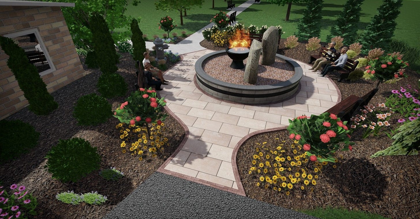 Thanks to a generous donation from the Frank G. and Frieda K. Brotz Family Foundation, work began on the memorial earlier this month. A statue will be the centerpiece of the gathering spot along with a plaque with the names of honorary members who have passed away. The memorial will be linked to Firehouse Park via a sidewalk. Planning started about a year ago according to Fire Investigator Tim Ellis.
